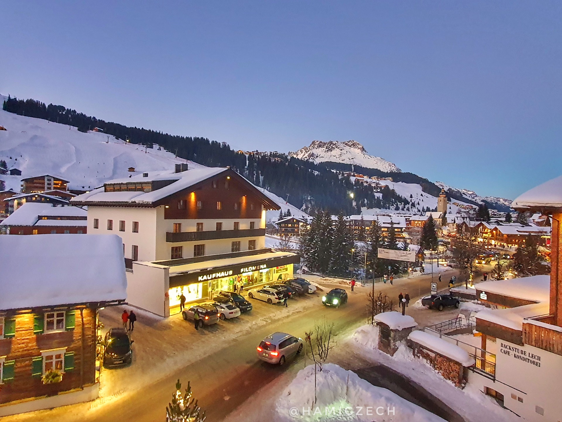 The hotel has several types of rooms, from single and double to family, and even different levels. We had a room Double room superior No. 306 on the third floor under the roof (elevator is here), with a balcony and a view of the town and the slopes, it was a bomb! In my opinion, this view is much better than in the garden. Although the hotel is right at the main road through Lech, it was quiet. Almost nothing runs here at night and the windows seal perfectly. At night, the town shines beautifully, as in a snowy Christmas fairy tale.