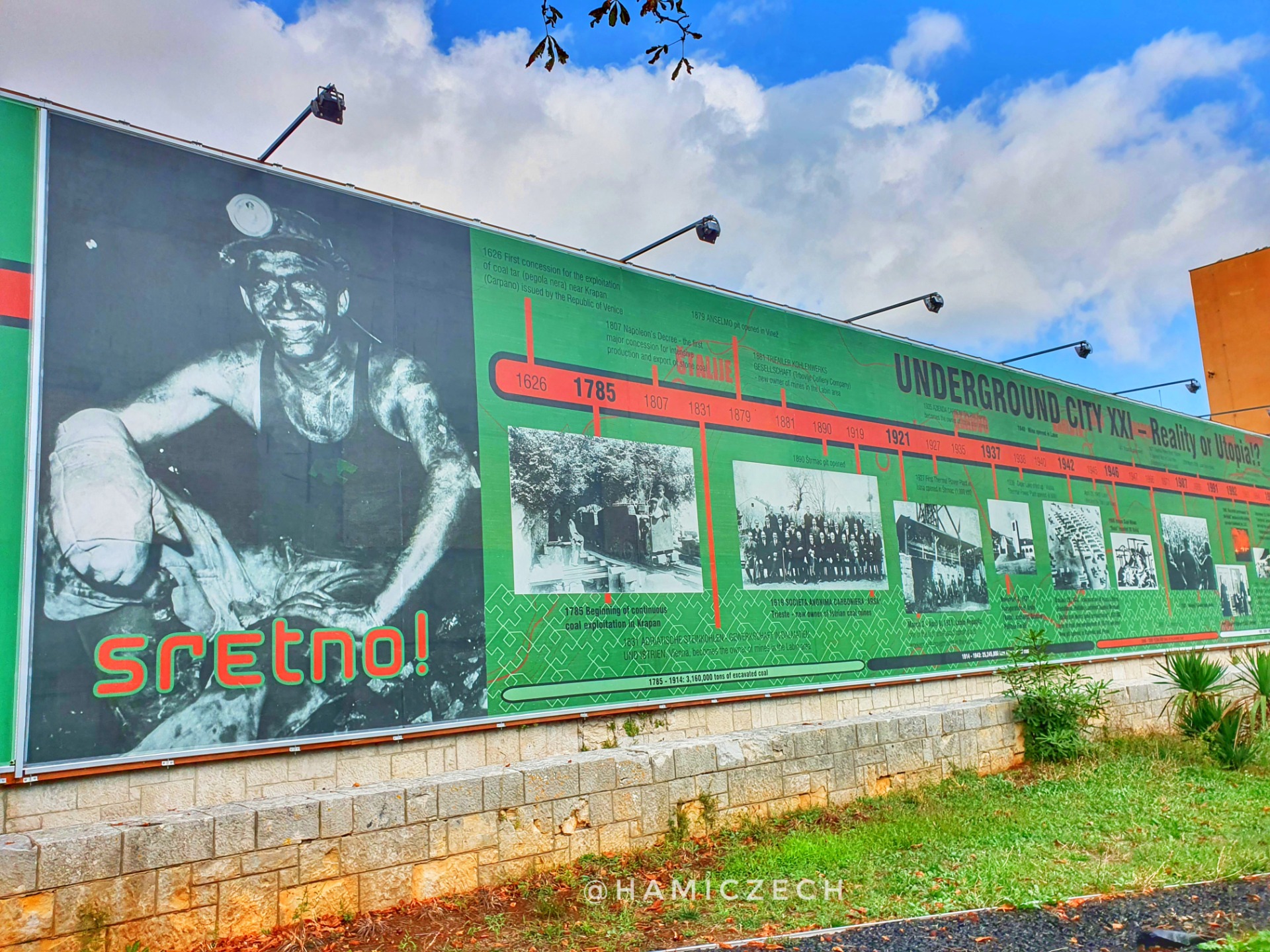 There is a preserved mining tower in Podlabin and mining flags were on poles all over the town. According to the plans, modern laboratories were to be built in the underground, see photos, but we could not find out if this plan had taken place, rather probably not, it looked quite like science fiction.